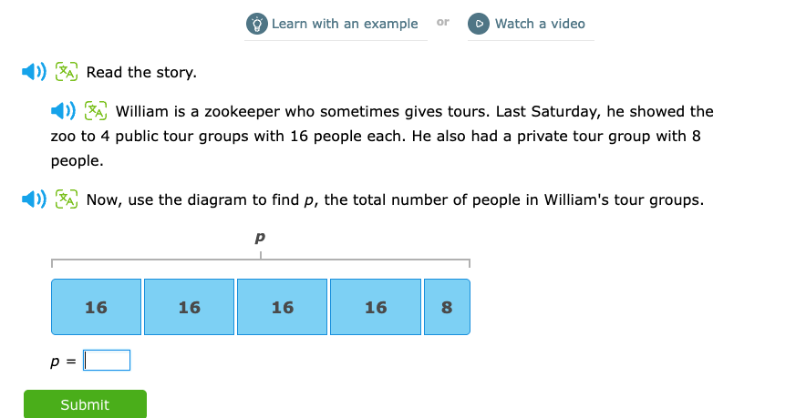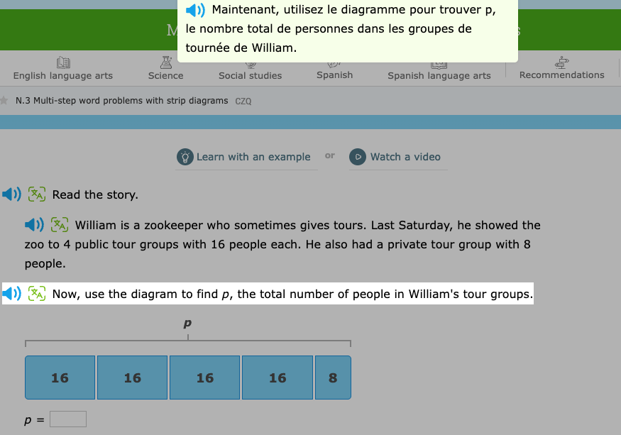 IXL provides Spanish text and audio support for all math skills, helping students make progress in math even if they are still building their English language abilities. This removes barriers to success for Spanish-speakers by allowing them to view and hear math questions in their native language.