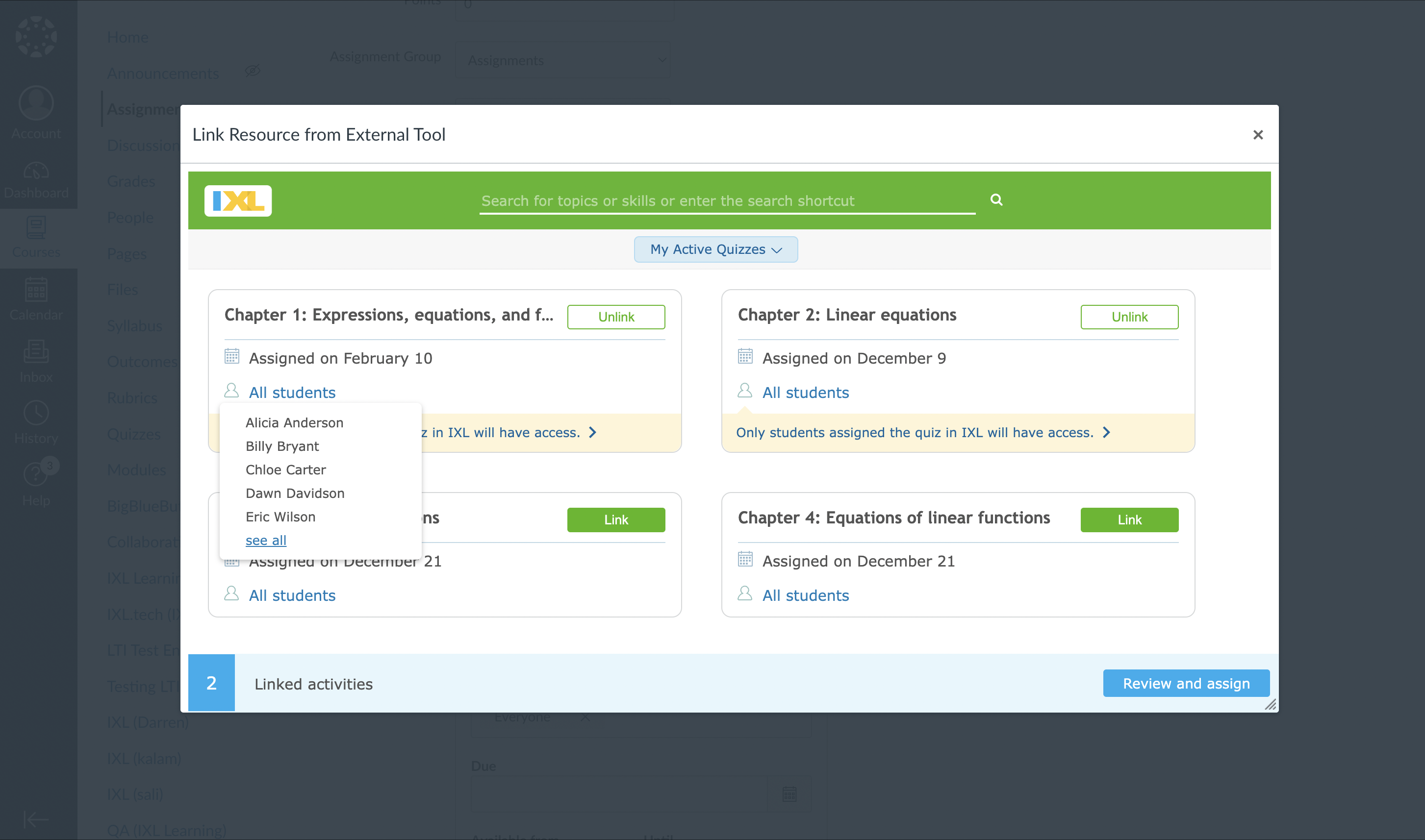 5. Activity selector – my active quizzes view – student hover
