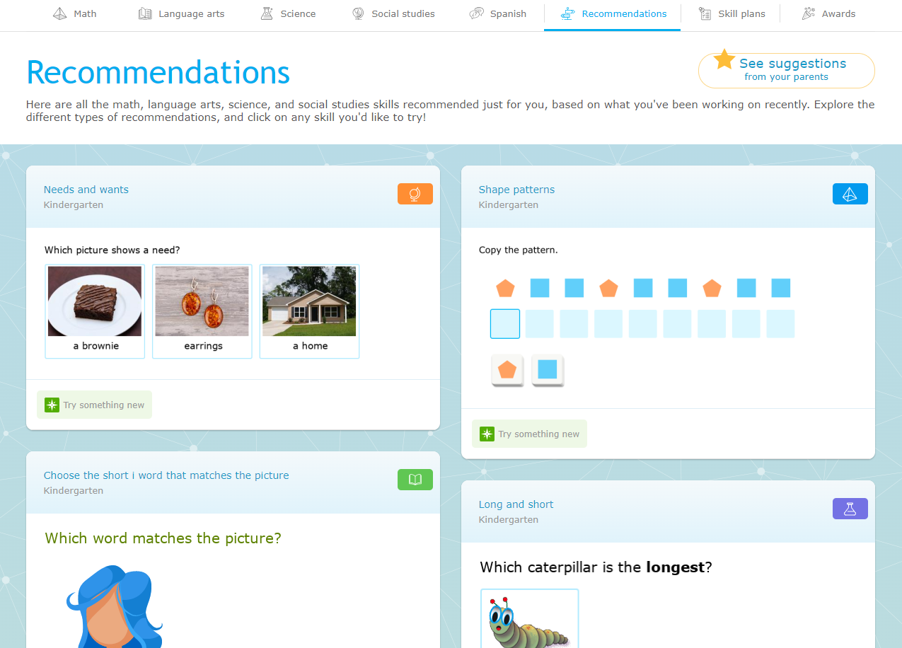 A feed of tiles show different recommended skills at a kindergarten level. Each tile shows a skill for a different subject, including math, English language arts, science, and social studies.