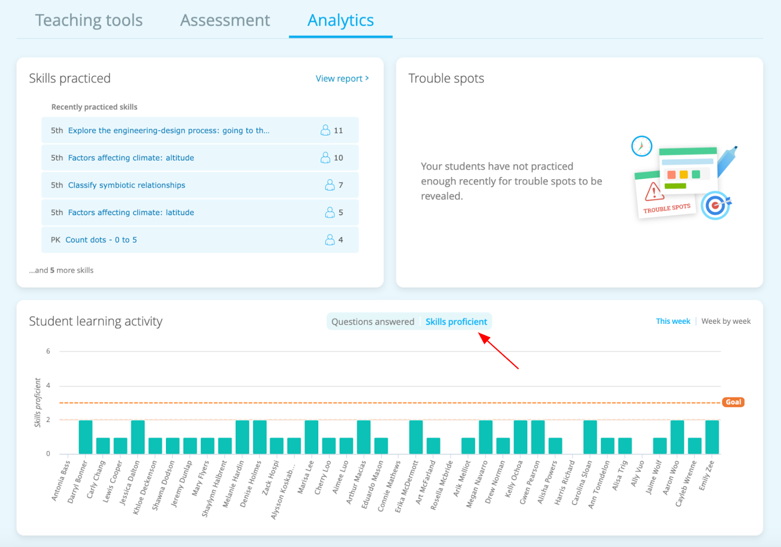 The Analytics tab of the teacher dashboard, which now has an option to show the number of weekly skills proficient instead of weekly questions answered