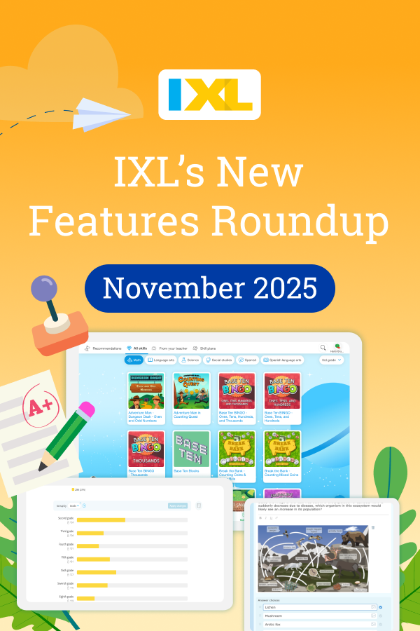At IXL, we never stop adding new features and skills to our award-winning teaching and learning platform, so you can always trust we’re on pace with students’ evolving needs. That’s why we compile a list of our top new features to help you—as a learner, educator, or parent—get the most out of IXL.