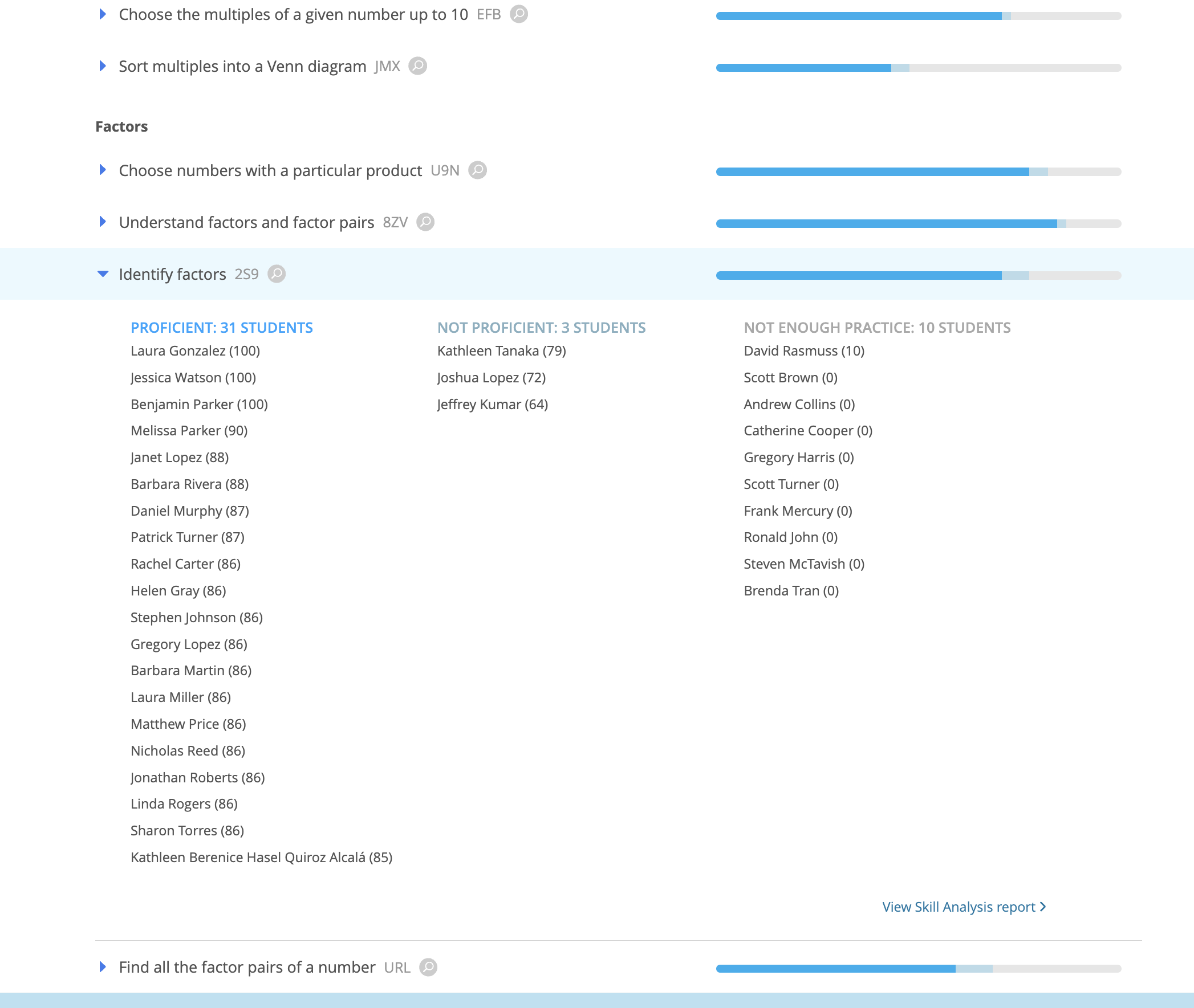 When you see a standard that needs further attention, drill down into students’ progress on each IXL skill aligned to that standard. For every standard-aligned skill, you’ll see the percentage of students who are proficient, not proficient, or don’t have enough practice yet, as well as individual students’ SmartScores.