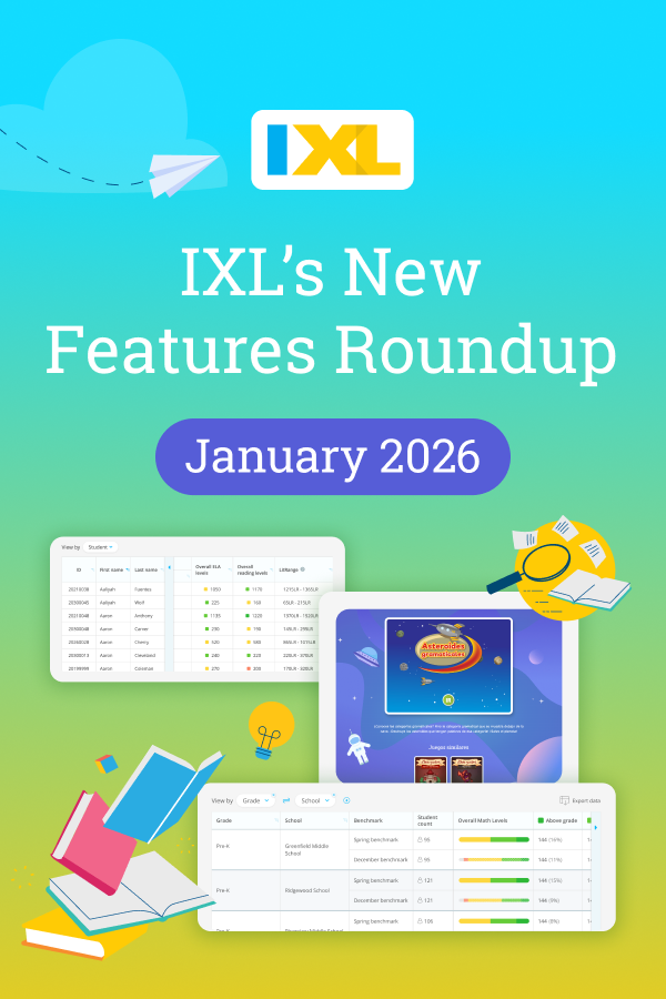 Keep reading below for a roundup of releases from January, including IXL LitRange, Spanish language arts games, multiple groupings for LevelUp™ Diagnostic results data, and more! To stay current with our latest updates, follow IXL on Facebook, Instagram, X, and LinkedIn.